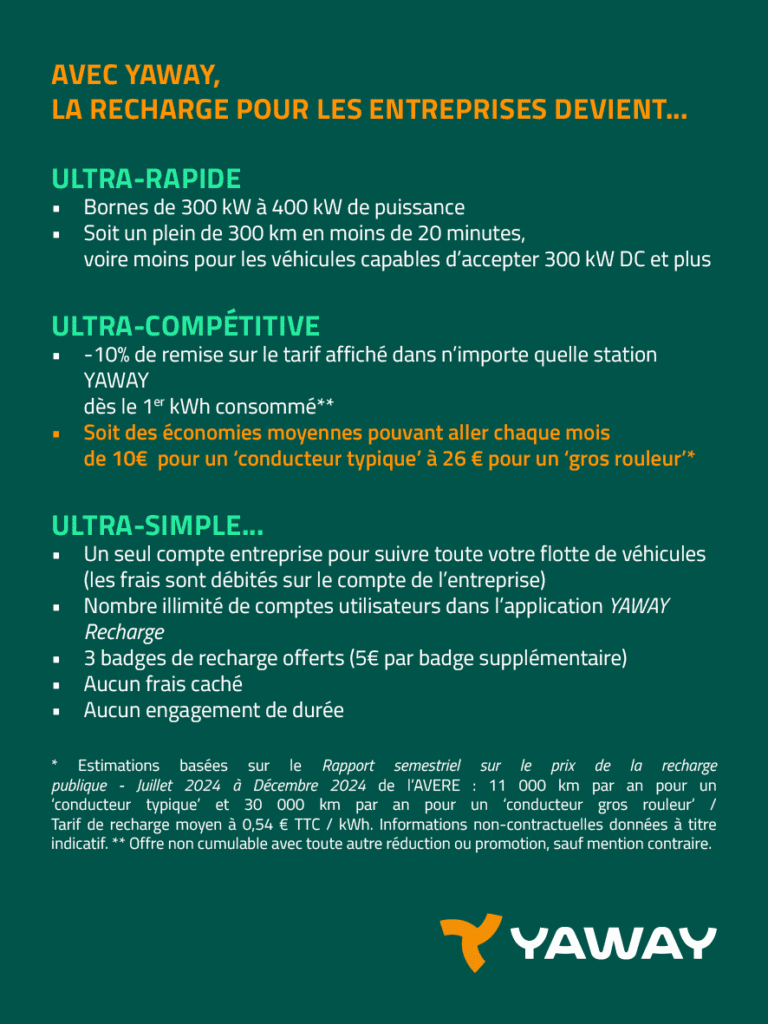 YAWAY : le réseau de stations de recharge très haute puissance de Kallista Energy avec 100% d’énergies renouvelables et des tarifs compétitifs.